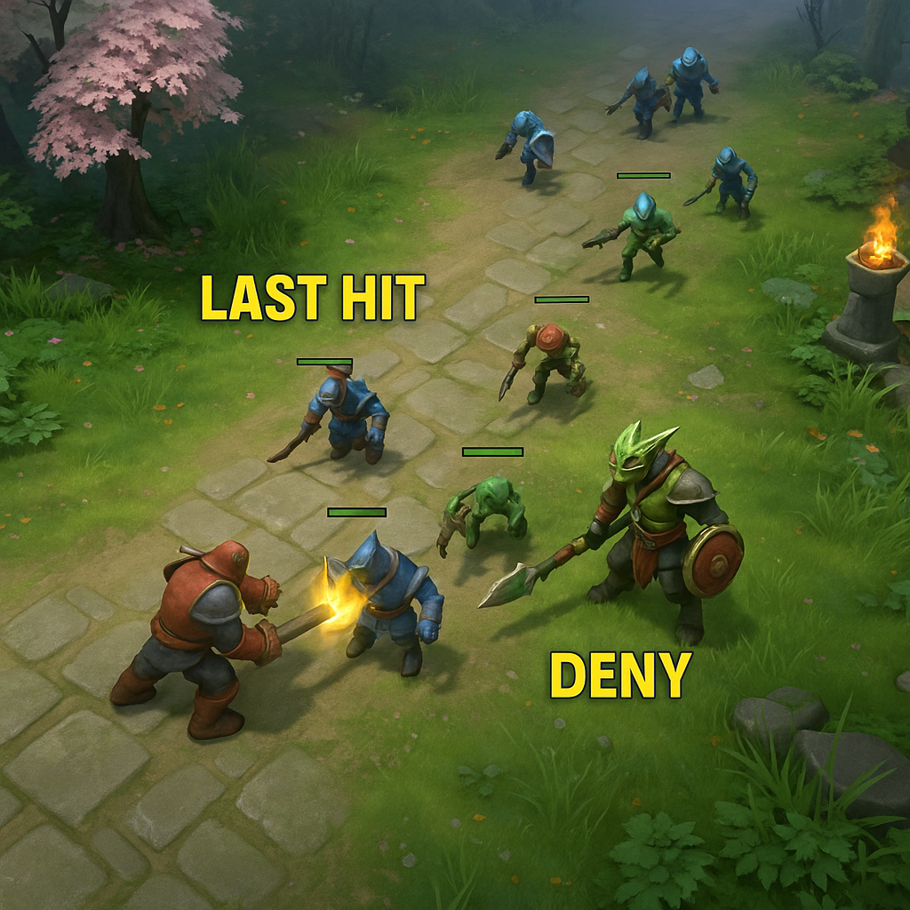- Lane Control: Good last-hitting helps control “creep equilibrium,” keeping the lane near your tower for safer farming.